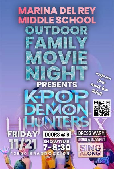 Friday 11/21 inhMarina Del Rey Middle School, 12500 Braddock Drive. s for a free outdoor family movie night featuring K-Pop Demon Hunters!